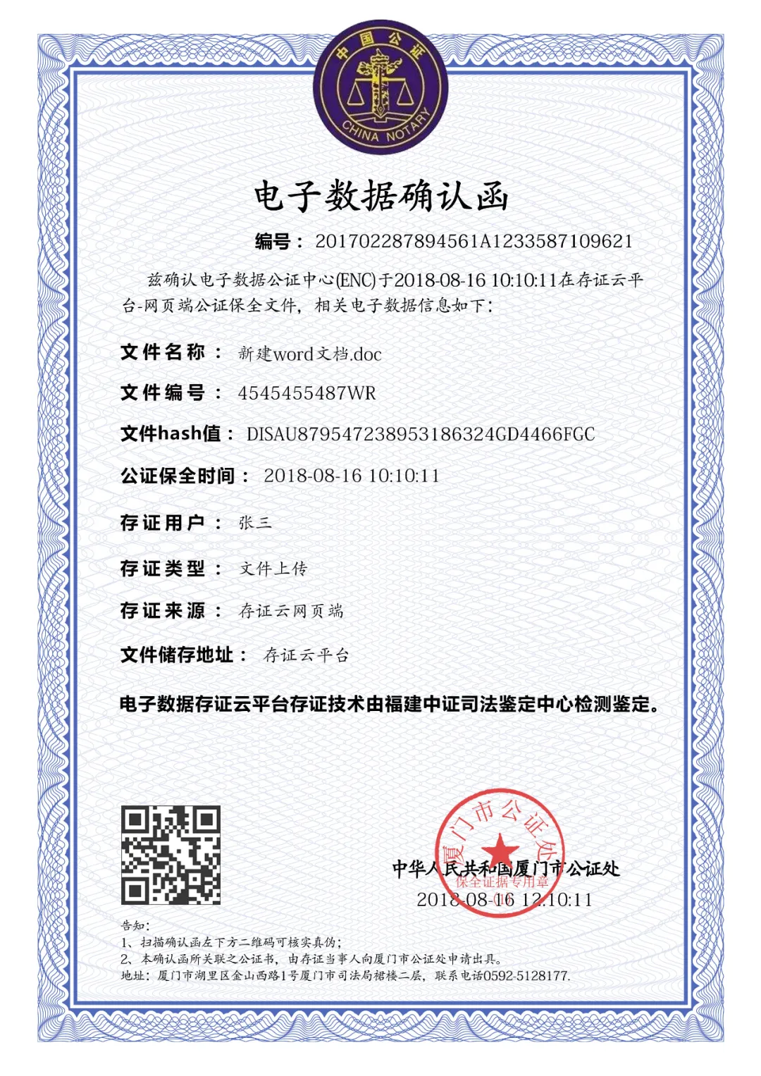 使用录音存证宝APP存证文件或照片/视频/音频等电子数据,平台都会生成一份具有法律效力的电子数据确认函,国家授时中心加持进一步提升电子数据证明效力,全国通用,可凭此公证文书开设相关公证书证明。